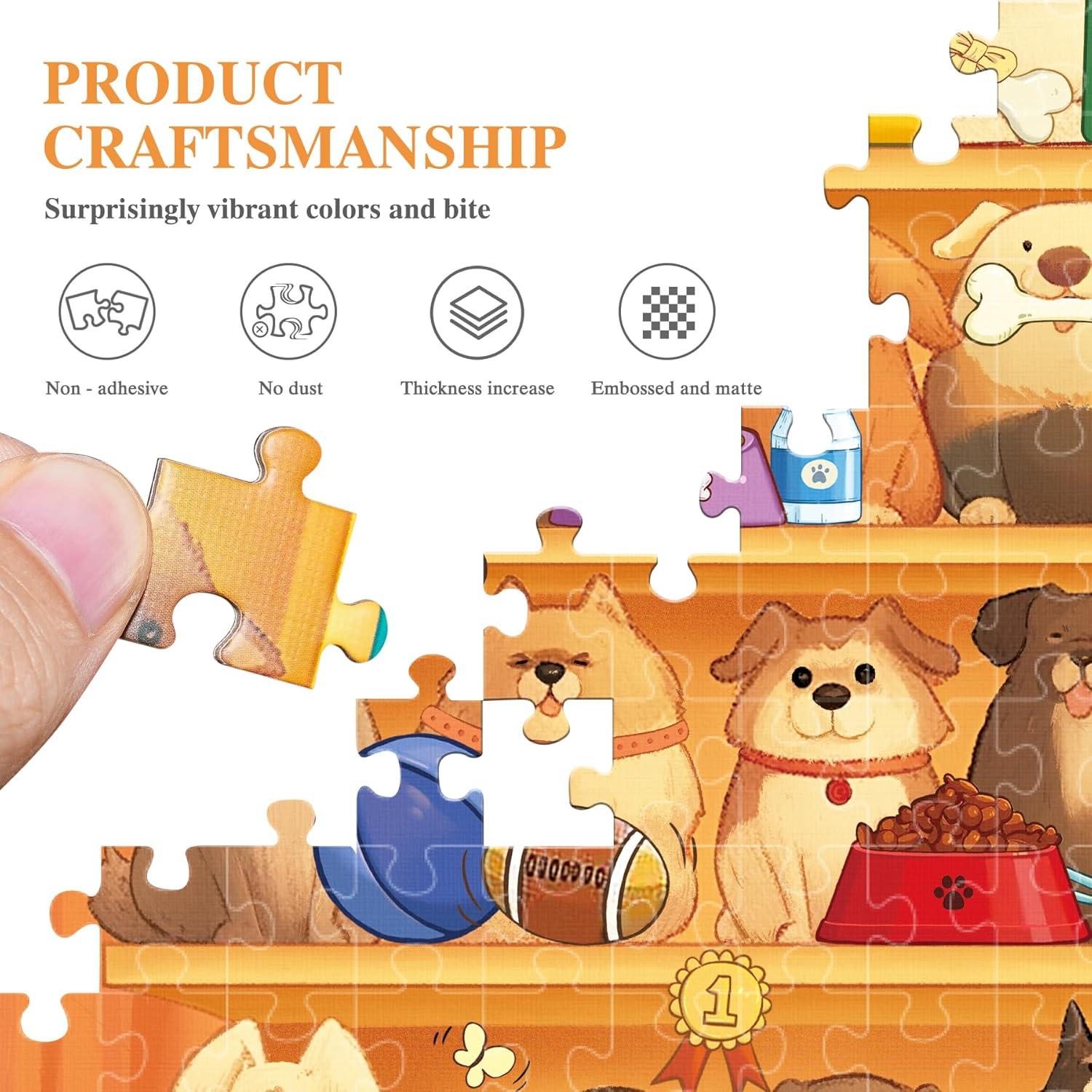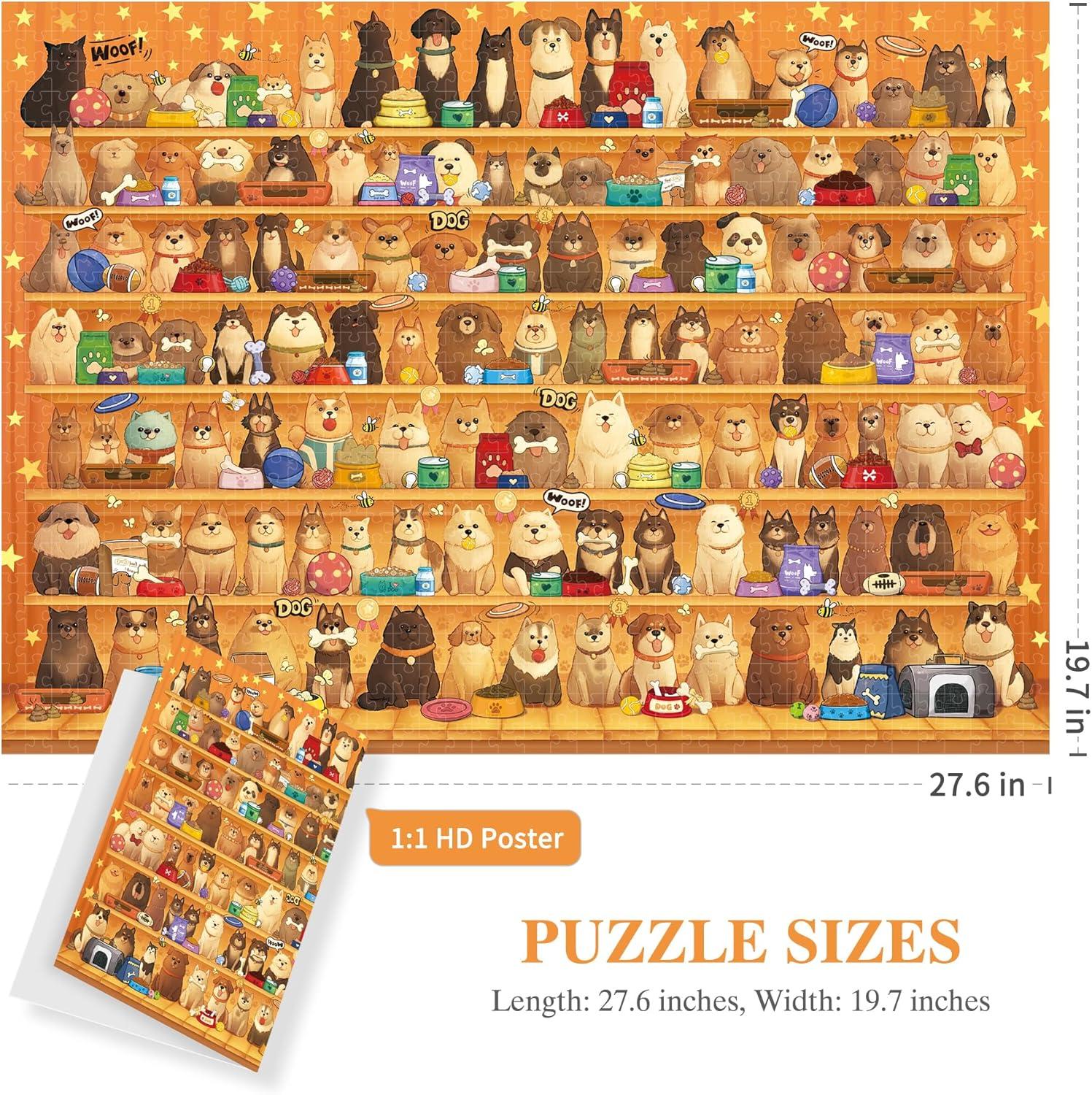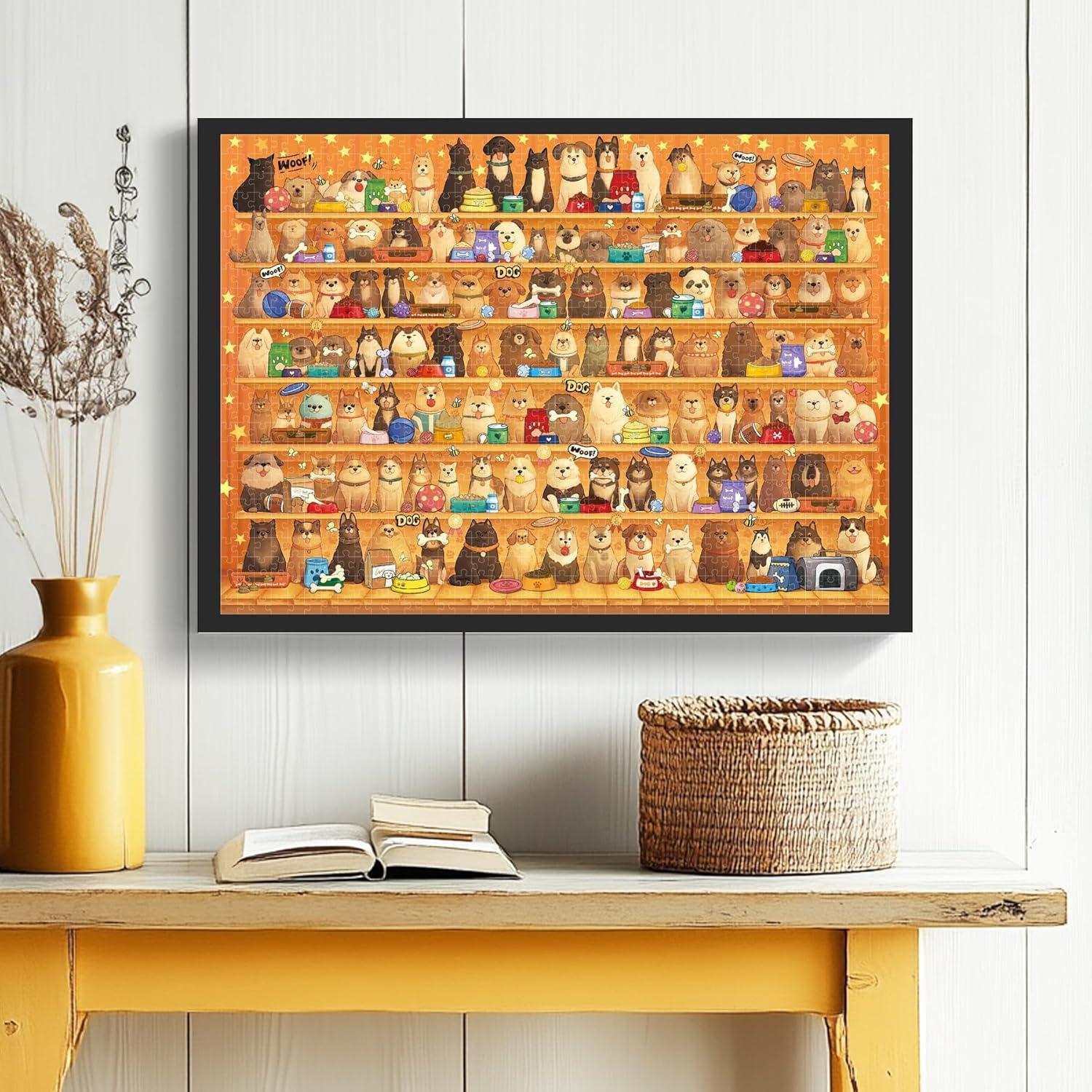 Vivid and Engaging Design: Delight in vibrant 1000 piece puzzle for adults scenes featuring playful dogs in a whimsical shop and a serene countryside. With rich colors and intricate details, these puzzles offer a fun challenge and a visually charming experience. These puzzles offer a fun challenge and a visually charming experience